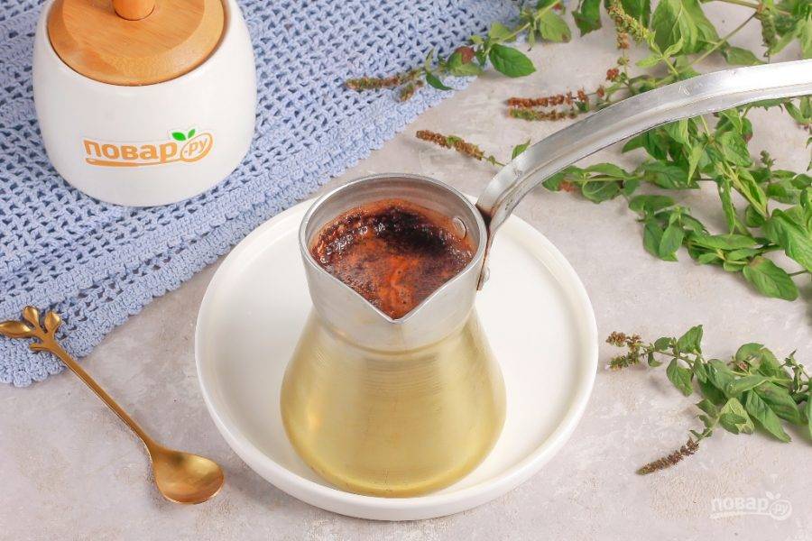 Влейте горячую воду и доведите кофе до кипения, заваривая его в течение 2-3 минут. Следите, чтобы пена не убежала за края емкости.