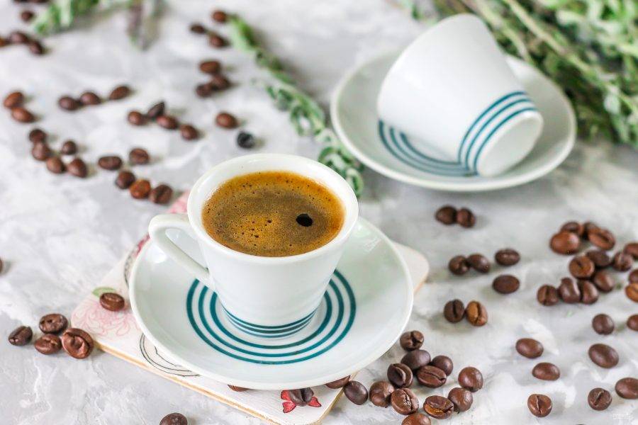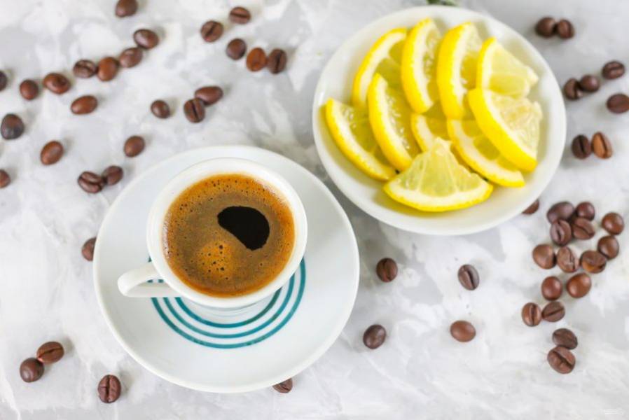Сварите кофе в кофемашине или в турке на плите. Он обязательно должен быть крепким, ароматным и бодрящим. Ошпарьте кипятком лимон и натрите лимонную цедру. Выложите небольшое ее количество в чашки и влейте кофе.
