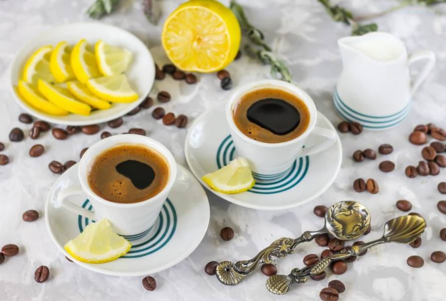 Нарежьте лимон дольками, выложите его на блюдце. Выжмите сок из двух долек лимона в каждую чашку с кофе, добавьте сахарный песок по вкусу. По желанию сахар можно заменить цветочным медом, если остудить напиток до 35 градусов, чтобы полезные свойства меда не пропали.