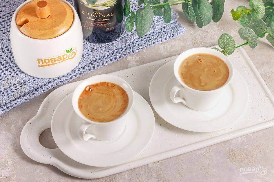 Заварите кофе кипятком, оставляя немного места в чашках для добавления Бейлиса. Аккуратно перемешайте кофе, чтобы сахар полностью растворился.