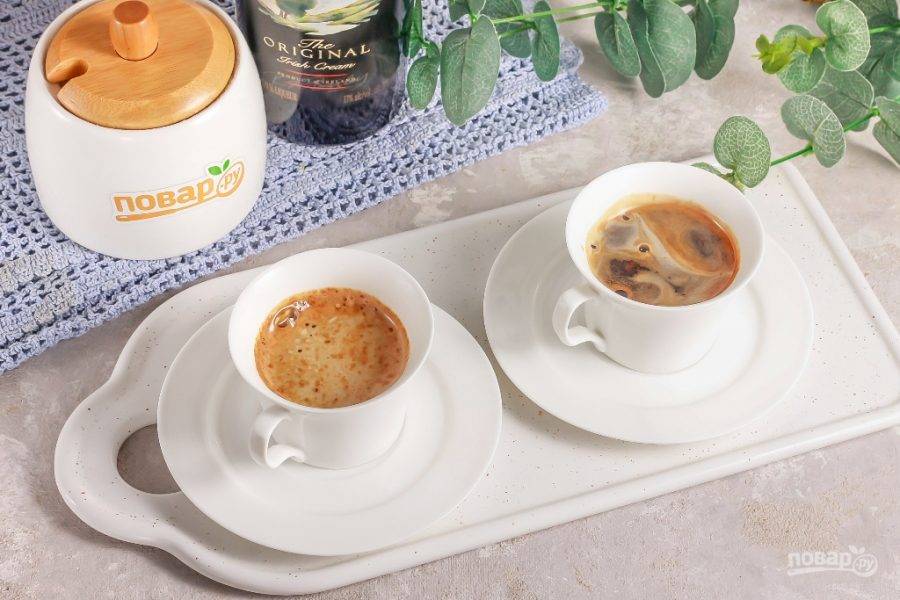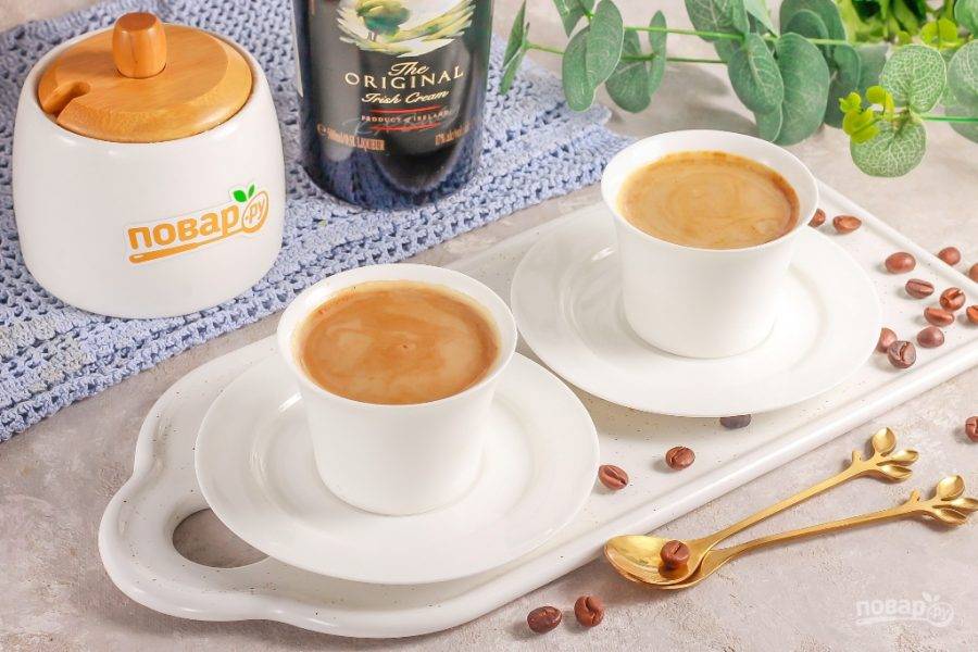 Влейте спиртной напиток по 20 мл. в чашки, заполняя их до верха. Норму добавляемого ликера вы можете регулировать сами по своему вкусу и вкусу своих родных. Аккуратно все перемешайте. Кофе с Бейлисом полностью готов! Если вы решите приготовить кофе в 200 мл. чашках, то норму ингредиентов рассчитывайте по формуле: 100 мл. кофе — 20 мл. ликера.