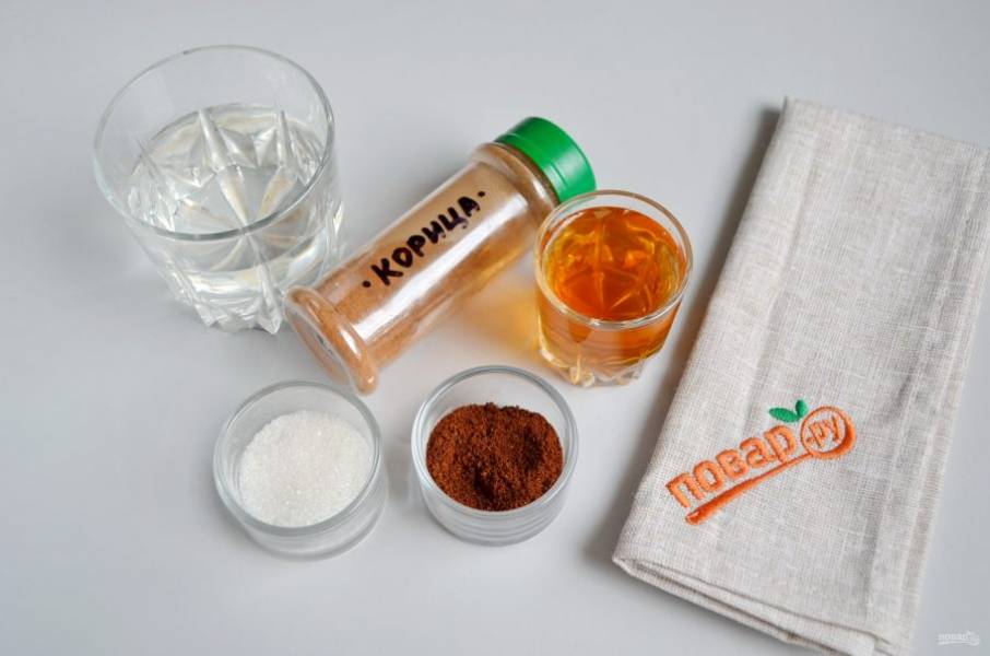 1. Подготовьте фильтрованную воду, натуральный свежесмолотый кофе, коньяк, сахар (по желанию) и корицу. Корицу можно взять молотую или палочку.
