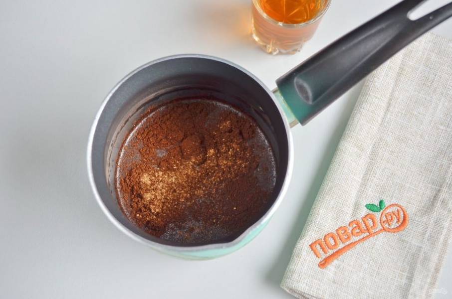 2. В турочку положите кофе, сахар, корицу. Залейте холодной фильтрованной водой. Поставьте на огонь и медленно доведите до кипения.