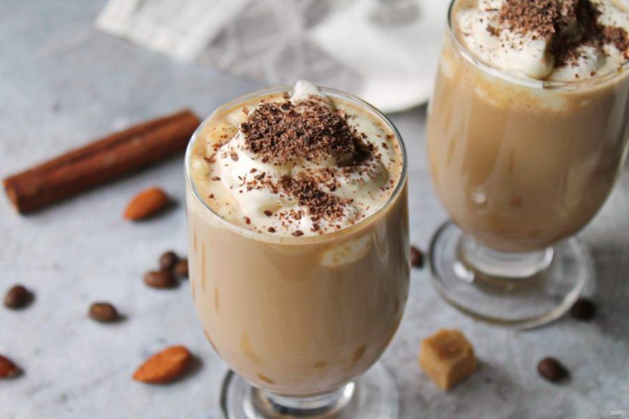 Сливки взбейте в пышную пену, выложите поверх кофе. Посыпьте тертым шоколадом и сразу подавайте к столу.