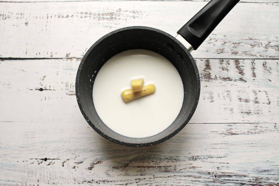 В сотейник налейте молоко, раскрошите марципан и варите все на среднем огне, перемешивая, до растворения марципана.