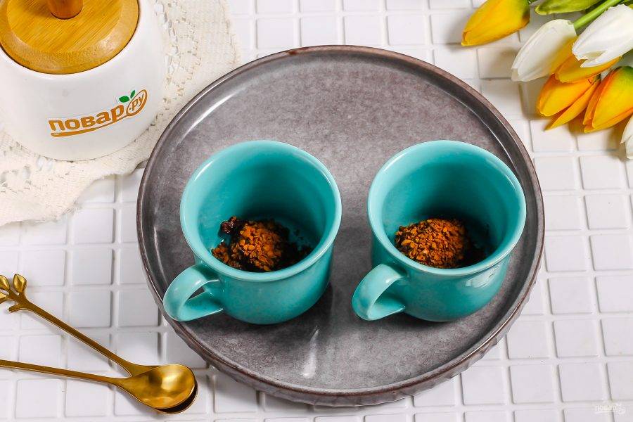 Всыпьте в каждую чашку по 2 грамма растворимого кофе. Если используете молотый кофе, то заварите его в турке или джезве.