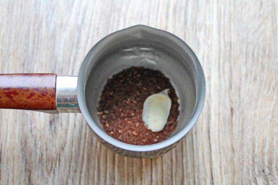 В турку всыпьте кофе и добавьте очень тоненькую пластинку чеснока.