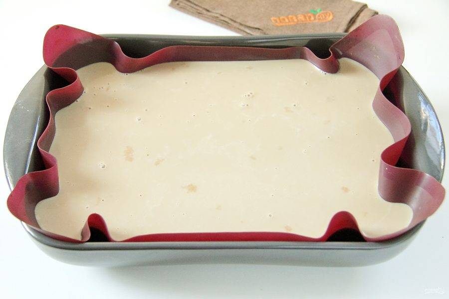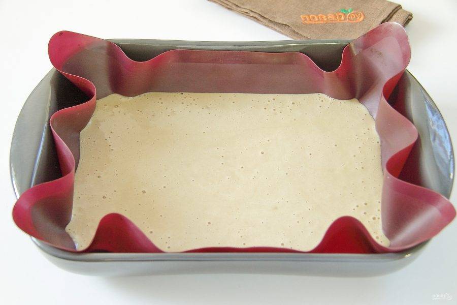 Форму застелите пергаментом (у меня силиконовый коврик) и вылейте тесто.