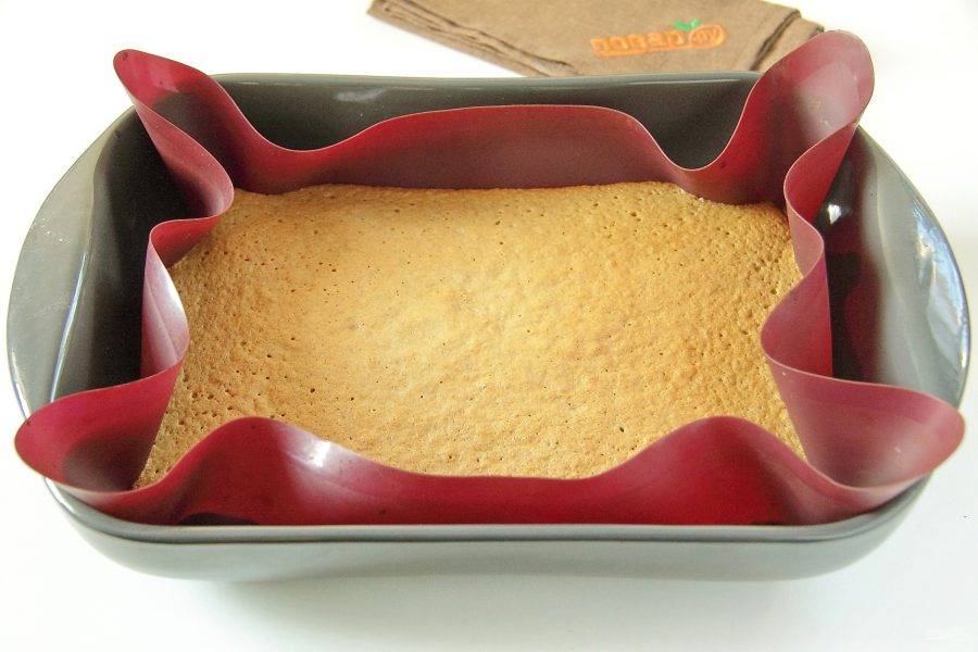 Готовому бисквиту дайте остыть прямо в форме. Затем соедините сливки и сахар. Взбейте, добавьте 200 мл кофе и перемешайте. Желатин заранее замочите в 200 мл воды до набухания, распустите на водяной бане и добавьте к сливкам. Все хорошо перемешайте и вылейте сливочную массу на остывший корж. Уберите десерт в холодильник примерно на 4 часа.