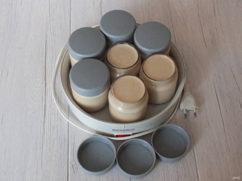 Йогурт можно сделать как в мультиварке, так и в йогуртнице. Я предпочла последний вариант. В чистые, сухие баночки разлейте подготовленную молочную смесь.