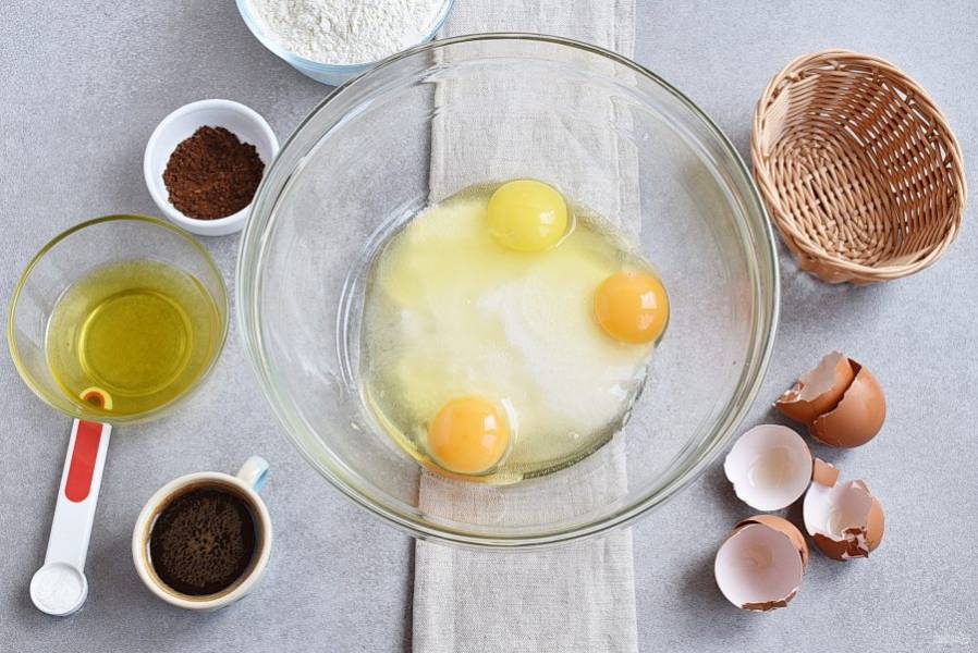 Включите духовку на разогрев до температуры 170 градусов. Взбейте яйца с сахаром до увеличения объема втрое и образования пышной пены.