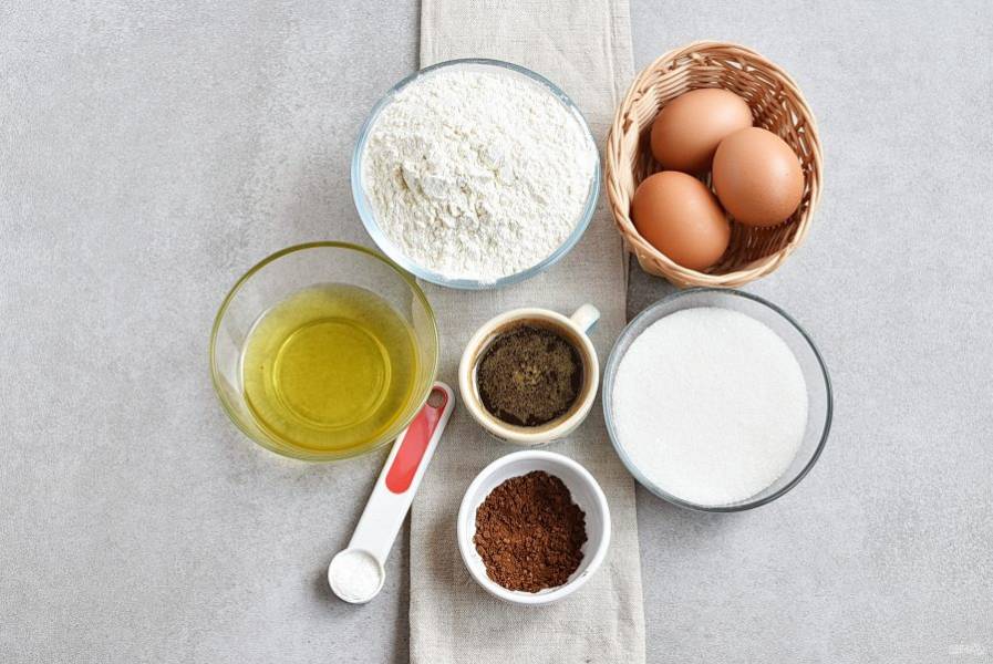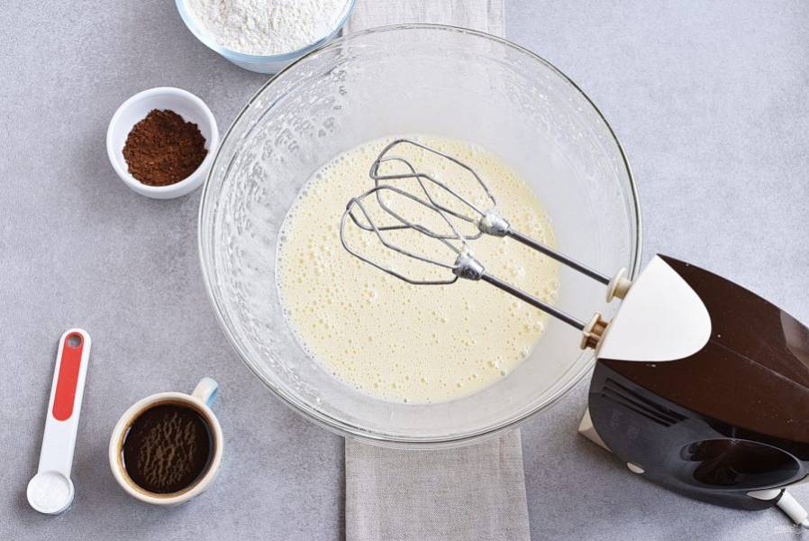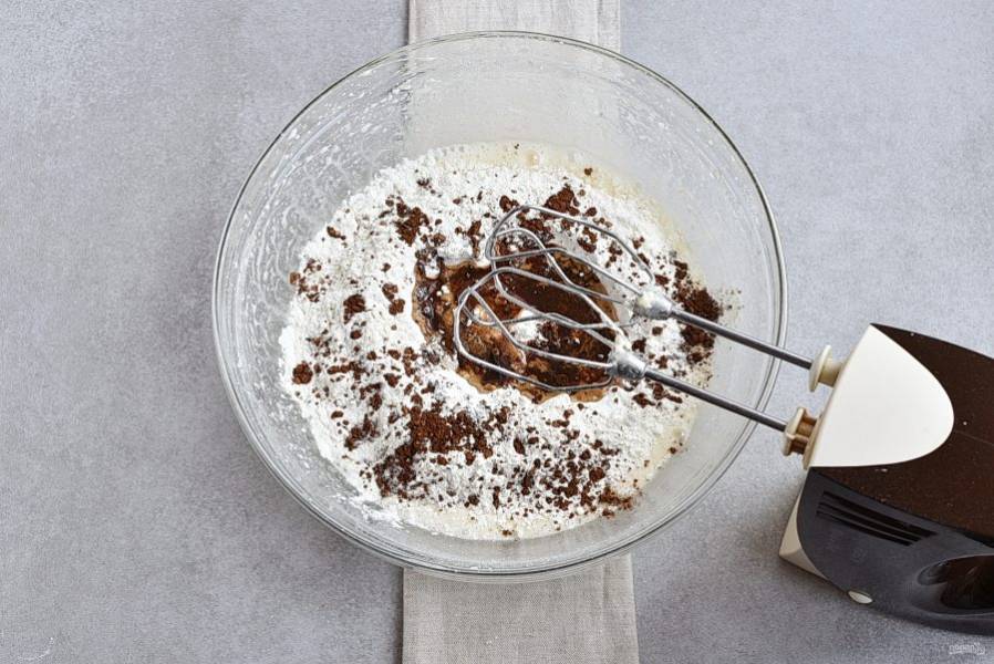 Всыпьте просеянную с разрыхлителем и солью муку. Сверху рассыпьте молотый кофе, если используете. Влейте 100 мл. кофе.