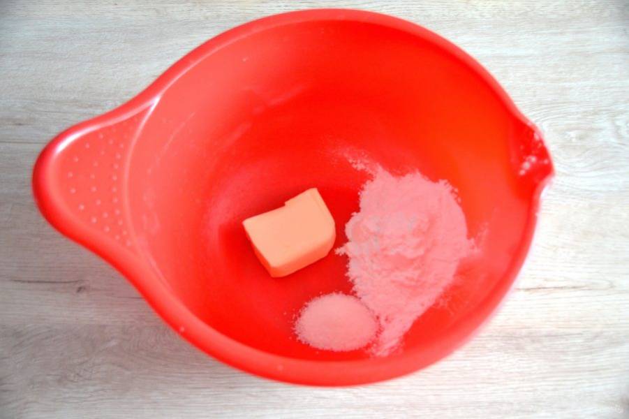 Разотрите до однородности 50 грамм мягкого сливочного масла, ванильный сахар и сахарную пудру.