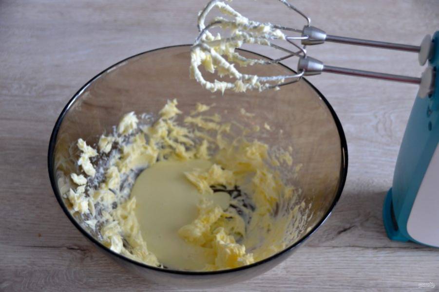 Взбейте до пышности мягкое сливочное масло со сгущенным молоком.