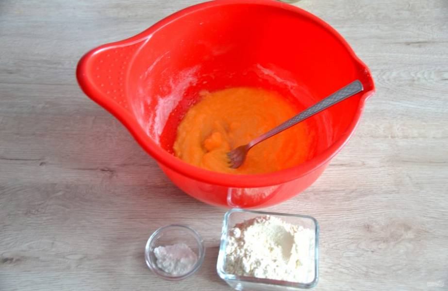 Смешайте муку, соль, разрыхлитель. Всыпьте к масляно-желтковой смеси, смешайте до однородного состояния.