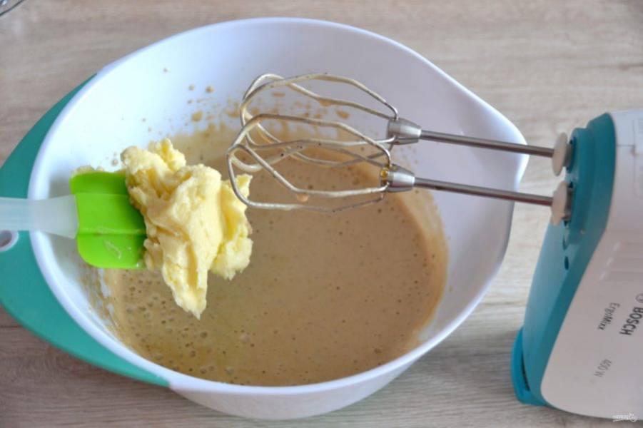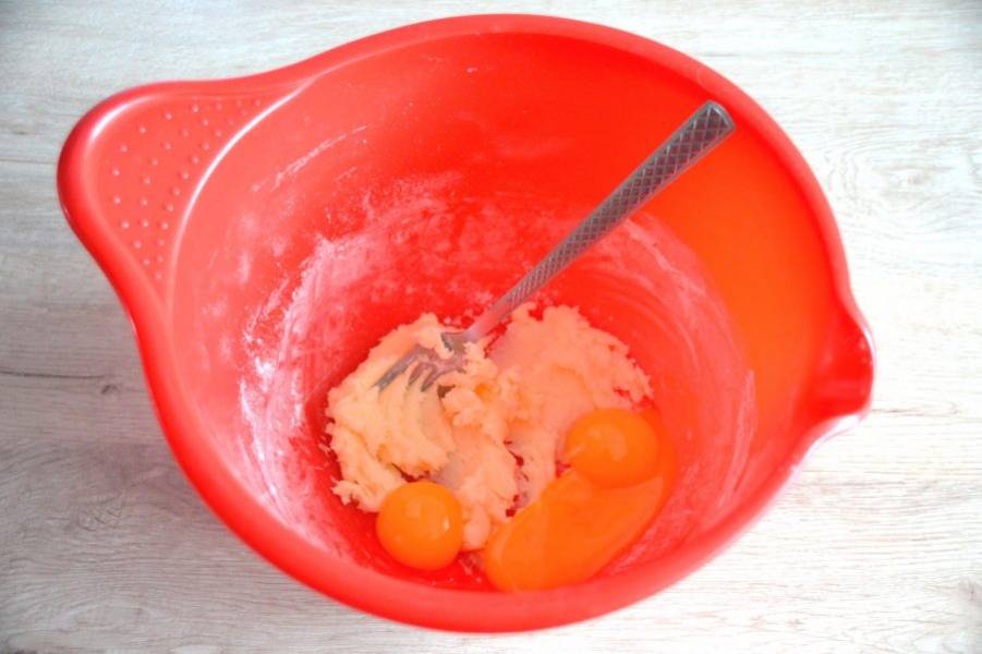 Отделите белки и желтки 3 яиц. Добавьте в масляную смесь 3 желтка и еще раз разотрите.