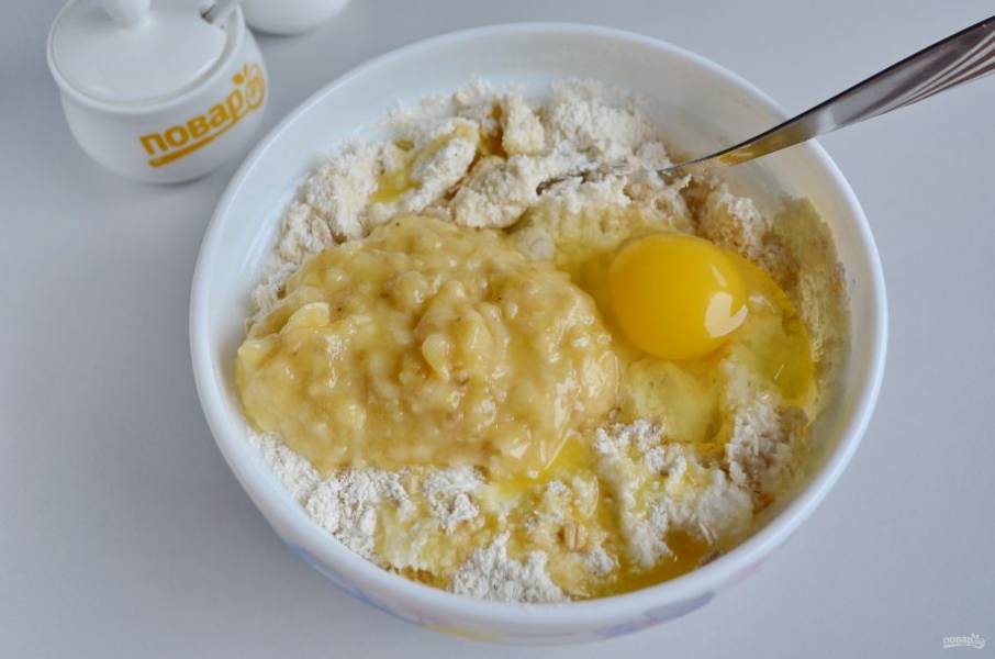 4. Влейте растопленное масло (или лучше размягченное), добавьте куриное яйцо и банан (предварительно разомните его вилочкой).