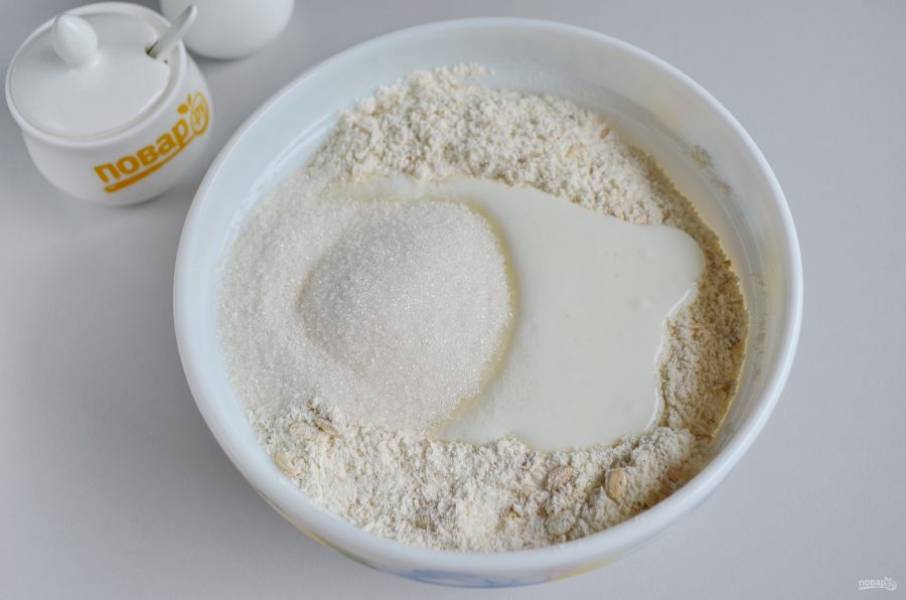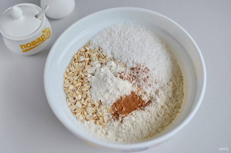 2. Возьмите сухую посудину, соедините в ней муку, кокосовую стружку, хлопья быстрого приготовления, мускатный орех, корицу молотую, разрыхлитель. Перемешайте.