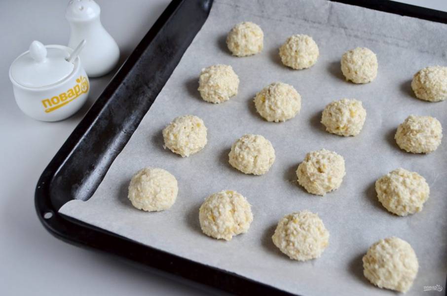 6. Разогрейте духовку до 190 градусов. С помощью двух чайных ложек выкладывайте печенье на пергамент. Можно формовать печенье мокрыми руками. Выпекайте по 15-20 минут.
