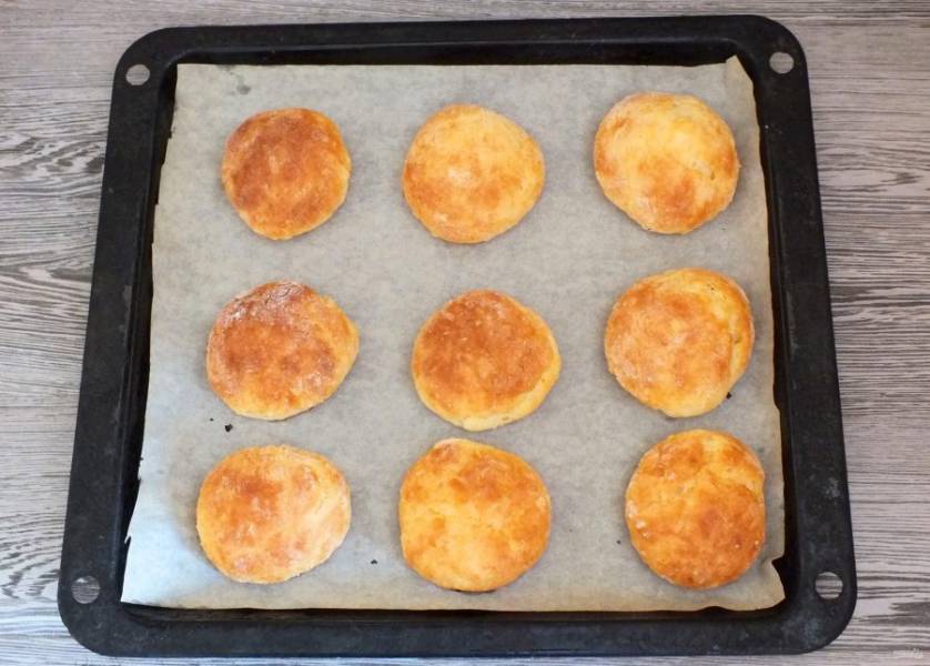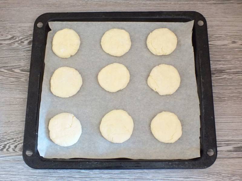 Заготовки укладывайте сразу же на противень, застеленный пергаментной бумагой. Включите духовку на 180 градусов. Поставьте противень в горячую духовку на 20-25 минут.
