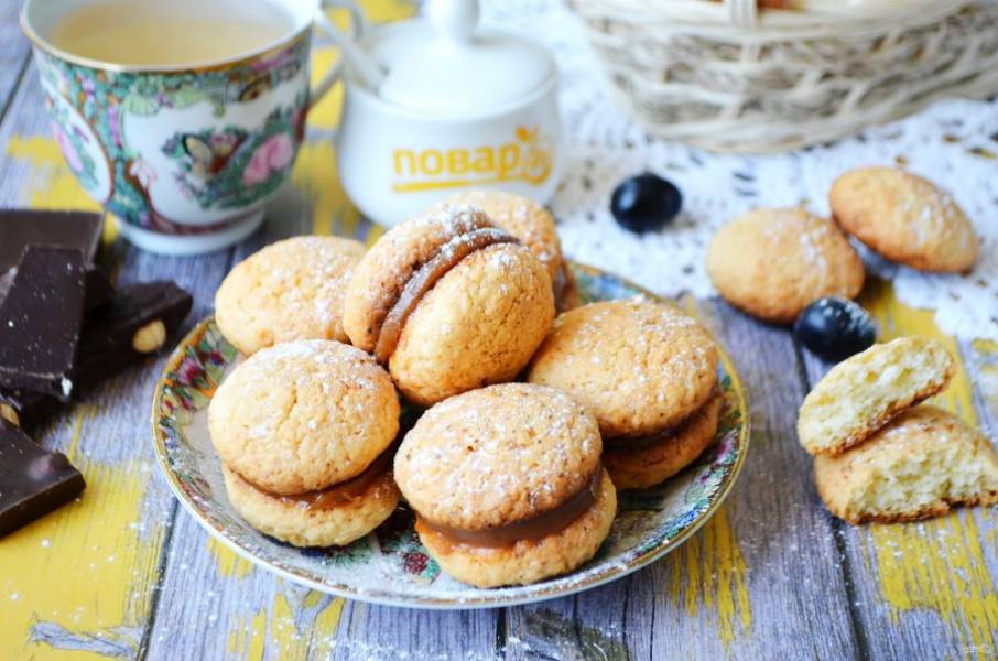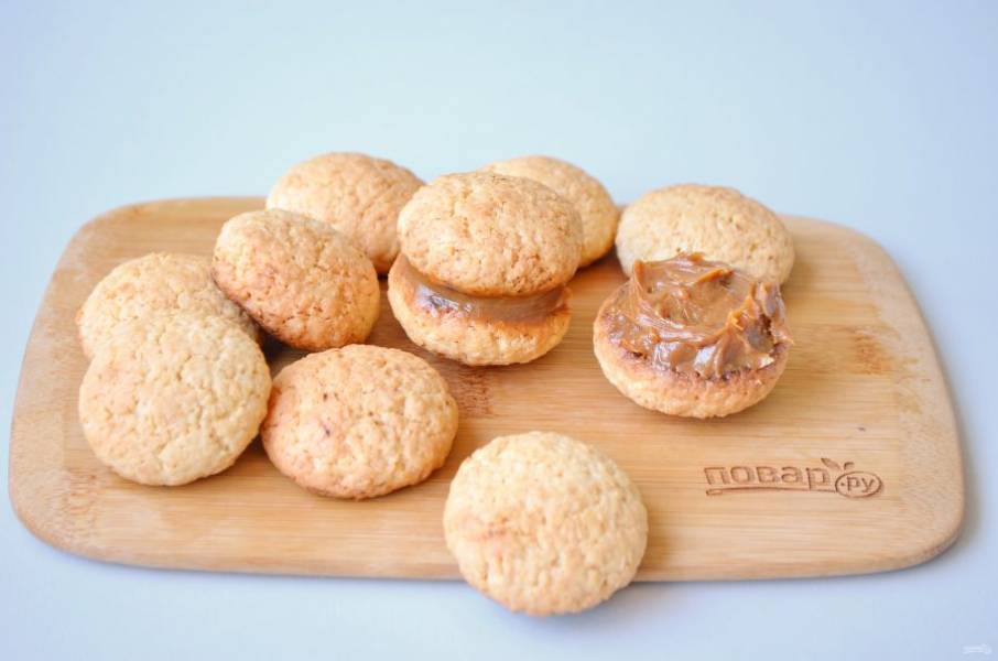 9. Готовое печенье остудите немного. Смажьте половинки сгущенкой вареной и склейте между собой.