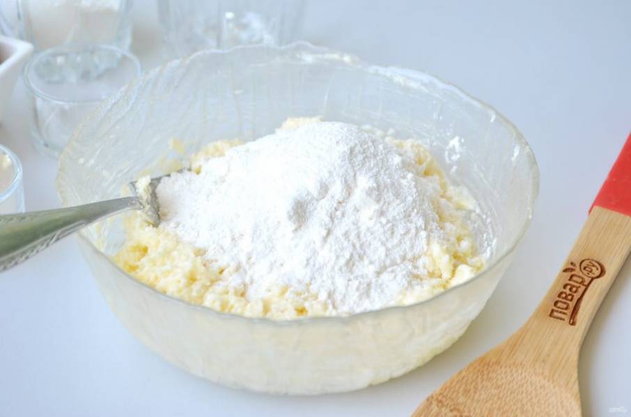 6. Муку соедините с разрыхлителем теста, добавьте к остальным ингредиентам. Перемешайте тщательно.