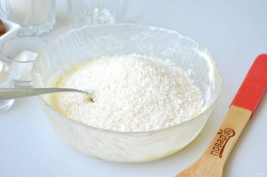 4. Добавьте кокосовую стружку, перемешайте тесто.