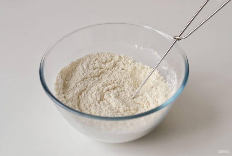 В большую миску просейте муку с сахаром и разрыхлителем.
