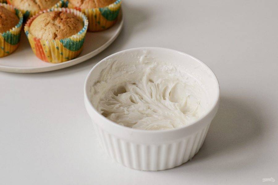 Покройте кремом кексы, украсьте кокосовой стружкой или кондитерской посыпкой. Приятного аппетита!