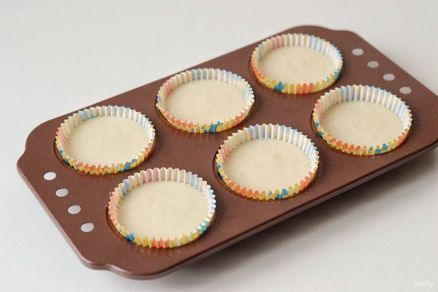 Разлейте тесто по формочкам. Выпекайте капкейки в духовке 30-35 минут при температуре 180 градусов.