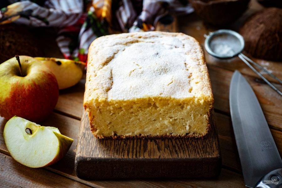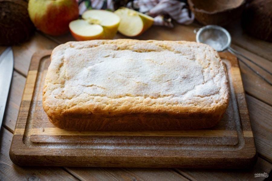 Выпекайте кокосовый кекс в заранее разогретой до 180 градусов духовке 40-45 минут. Затем готовый кекс полностью охладите. Перед подачей присыпьте по желанию сахарной пудрой.