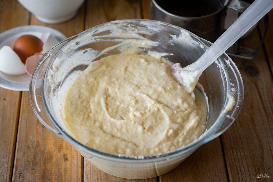 Вмешайте кокосовую муку в основное тесто с помощью лопатки. Готовое тесто получается очень вязкое, как густое оладьевое по консистенции.
