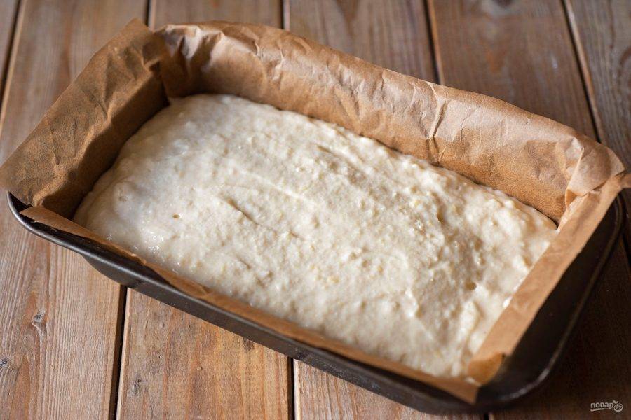 Форму для кекса выстелите пергаментом для выпекания и выложите все тесто, разравнивая лопаткой.