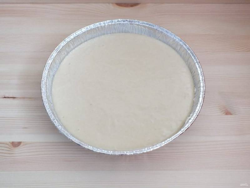 Форму диаметром 22-24 см., смажьте тонким слоем масла, если это необходимо. Перелейте тесто. Разогрейте духовку до 180 градусов.
