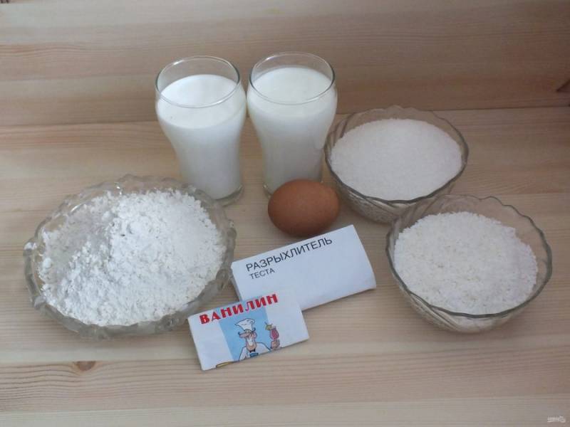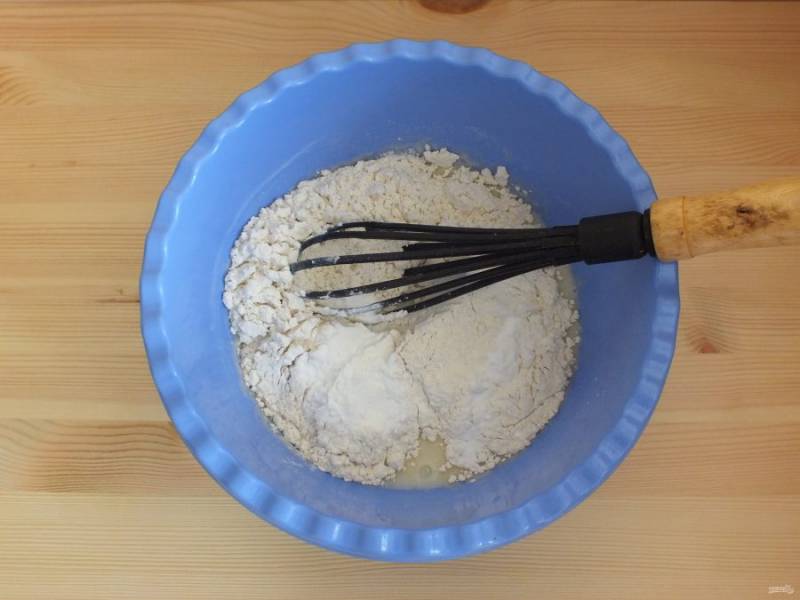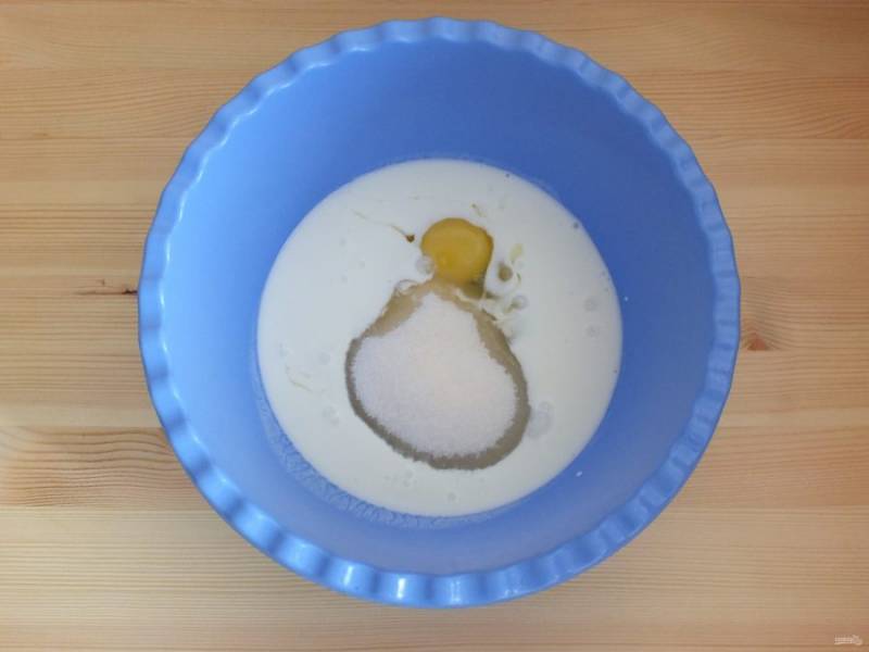 В глубокой чашке смешайте кефир, яйцо и сахар.