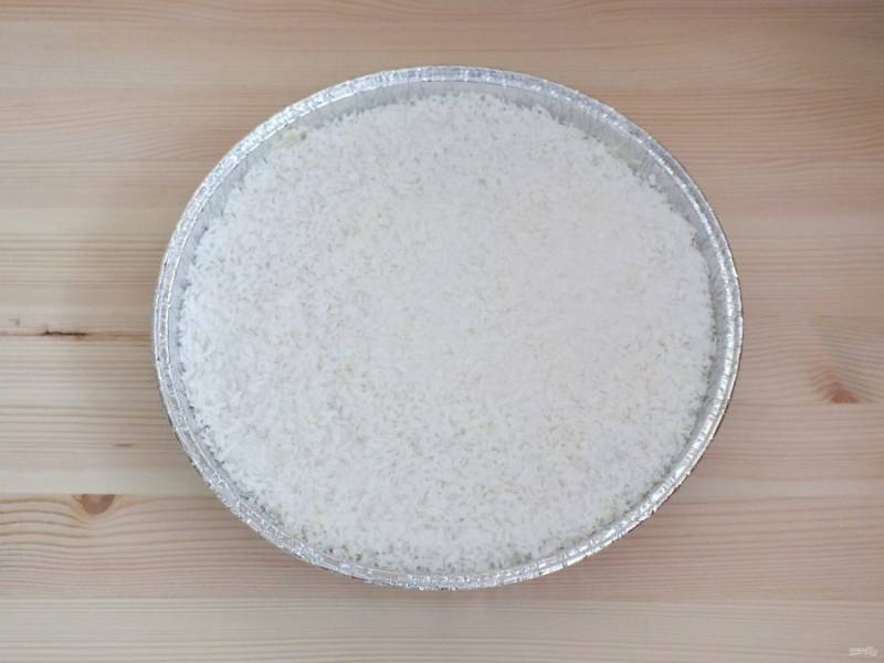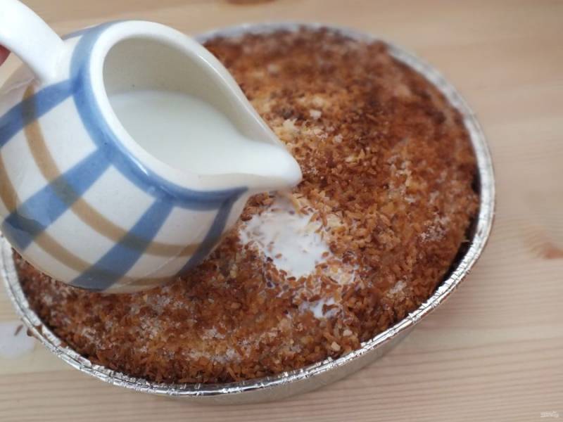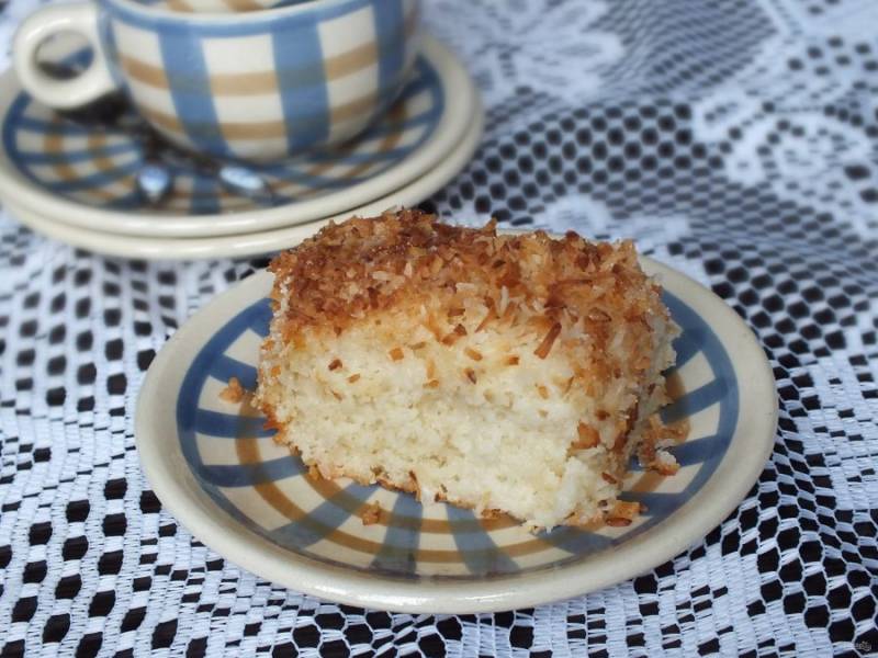 Полученной посыпкой засыпьте верх теста в форме. Поставьте в разогретую духовку на 30 минут. Наблюдайте за пирогом. Минут через 10 после начала выпечки, можно прикрыть верх, чтобы кокосовая стружка не подгорела. Готовность проверьте деревянной шпажкой, она должна быть сухой. Если пирог влажноватый, убавьте огонь до 160 градусов и подержите еще минут 10, сняв предварительно фольгу.