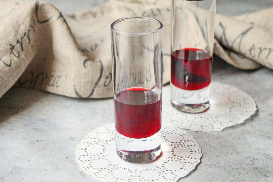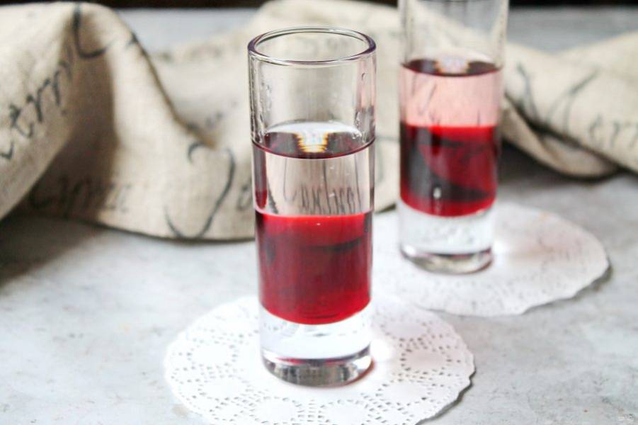 Очень аккуратно, по ручке барной ложки или лезвию ножа налейте водку. У вас должно получиться два слоя.