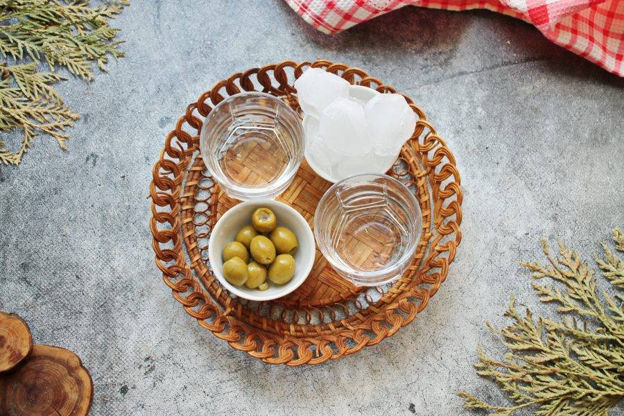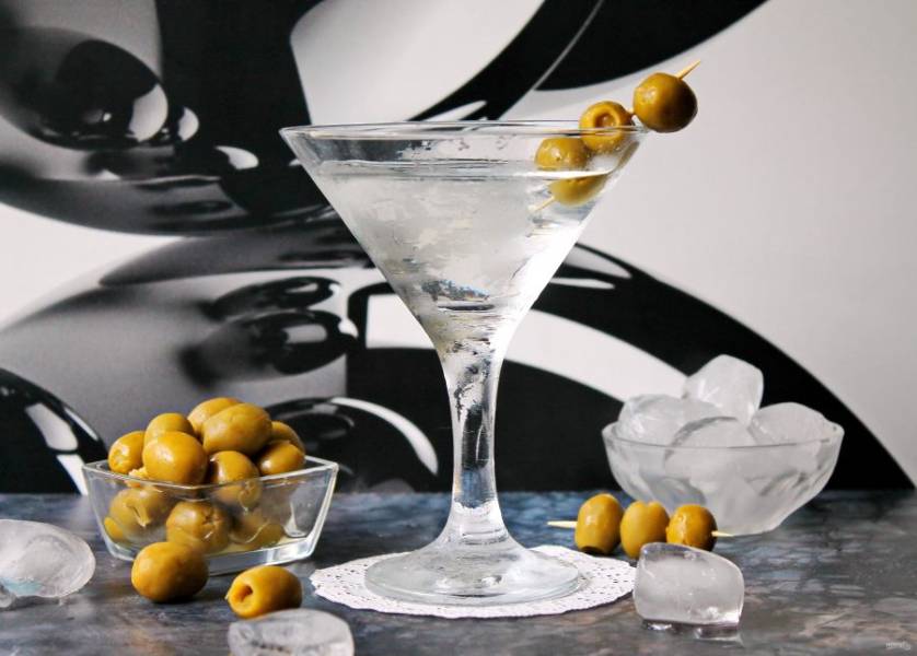 Влейте холодную водку, снова перемешайте и перелейте в охлажденный бокал. Украсьте оливками и сразу подавайте.