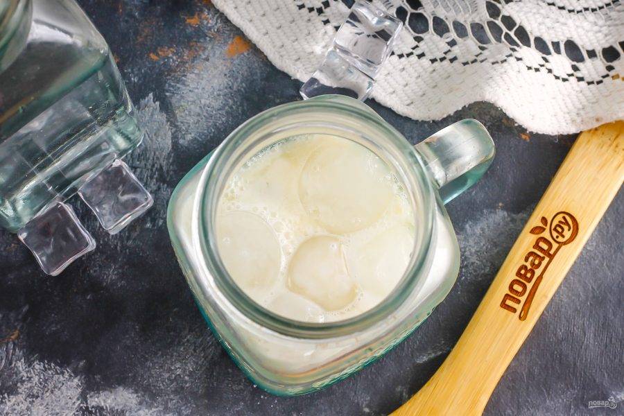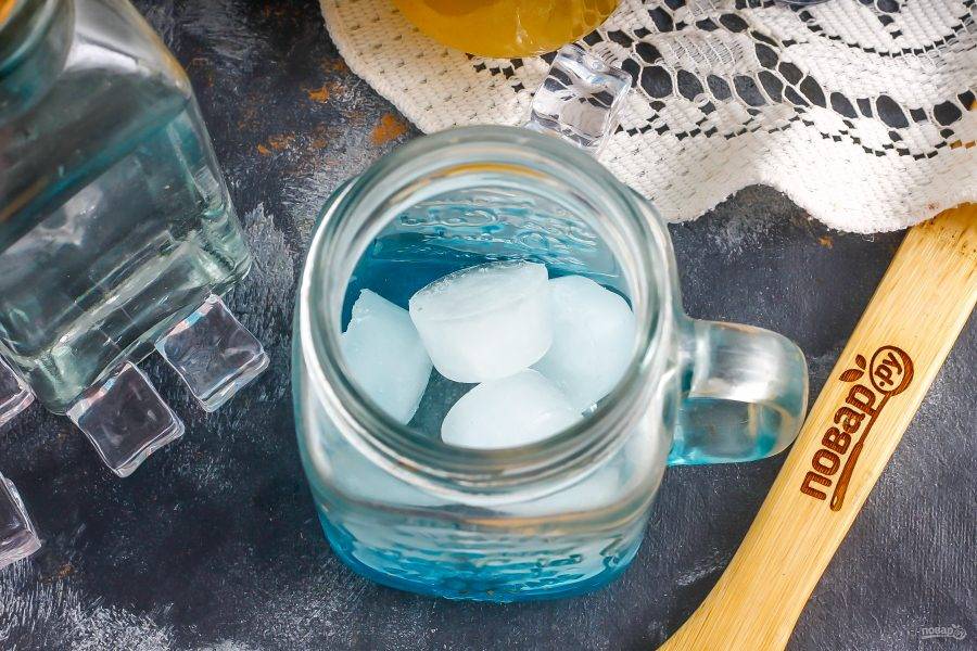 В шейкер или коктейльную банку высыпьте лед в кубиках.