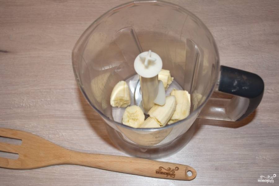 Для приготовления коктейля из банана и киви мы возьмем емкость блендера. Установите нож в центр емкости. Банан очистите и поместите в емкость.