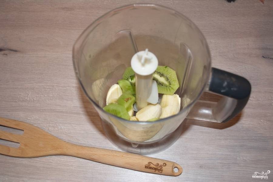 Киви необходимо очистить от шкурки. Нарезать крупно и поместить в емкость к банану.