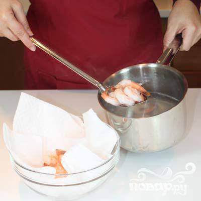 Бросить креветки в кипящую подсоленную воду. Варить в течении 5 минут.