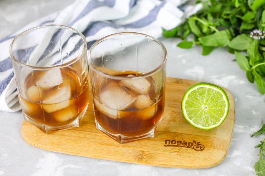 В стаканы выложите лед по 5-6 штук в каждую емкость. Влейте охлажденный золотистый ром. Соотношение алкоголя к кока-коле должно быть 1:2, поэтому ром должен быть охлажденным, иначе лед начнет быстро таять и соотношение коктейля нарушится.