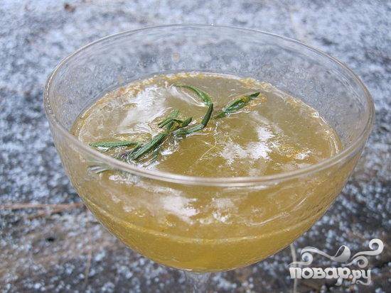 4. Шейкер доверху наполнить льдом, закрыть крышкой и сильно взболтать. Полученный коктейль перелить в треугольный бокал, долить его доверху шампанским, украсить веточкой розмарина и подавать на праздничный стол.