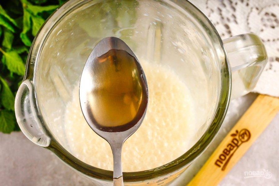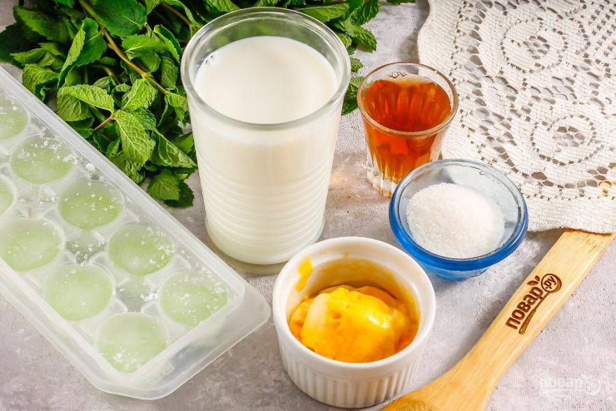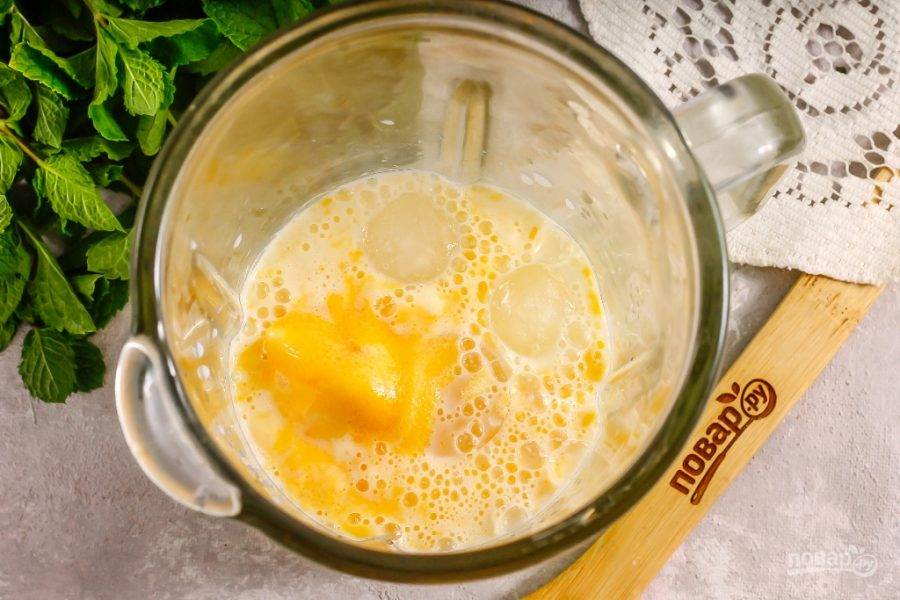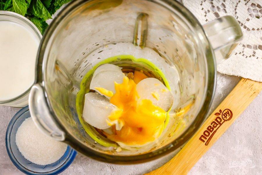 Влейте охлажденное молоко любой жирности и любого сорта и взбейте все содержимое емкости примерно 2-3 минуты, чтобы сахар и мороженое растворились, а лед — измельчился. Обязательно используйте пульсирующий режим техники, чтобы получилась пышная пена.