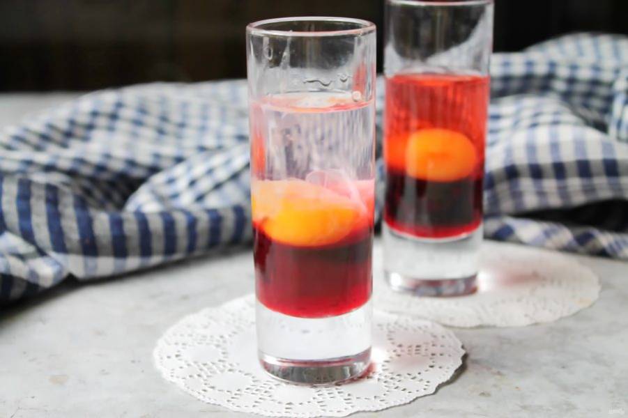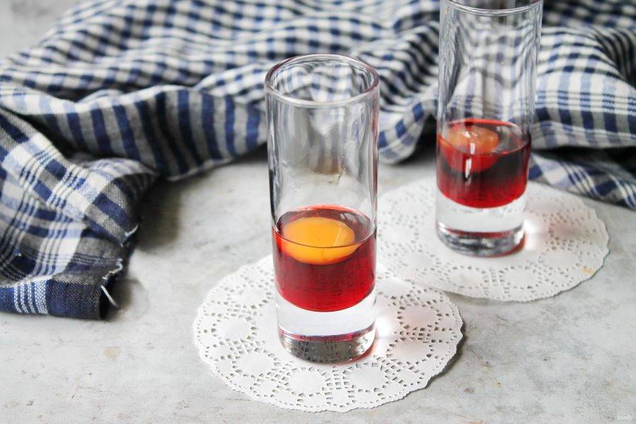 Через воронку осторожно наливаем вишневый ликер в узкую стопку. Он не должен попасть на стенки.