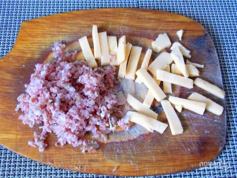 Нарежьте сыр брусочками, а колбасу натрите на крупной терке.