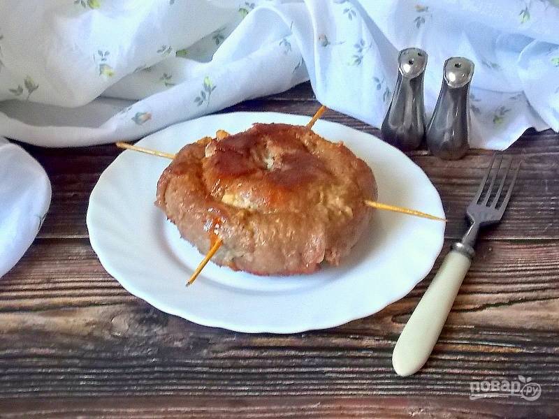 Сверните мясо в рулет, сверните улиткой и закрепите его при помощи шпажек. Посыпьте верх аджикой и посолите. Уберите в холодильник на 2 часа.
