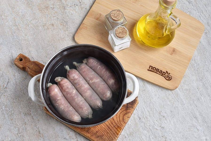 Параллельно отварите колбаски в подсоленном кипятке 5 минут. Они должны стать упругими и толстенькими.