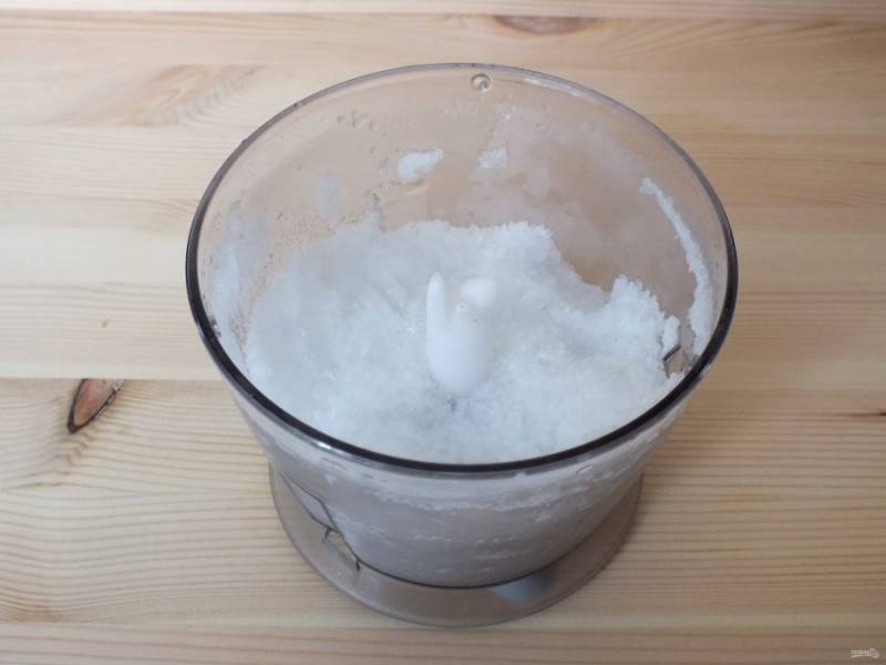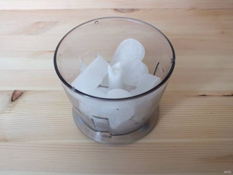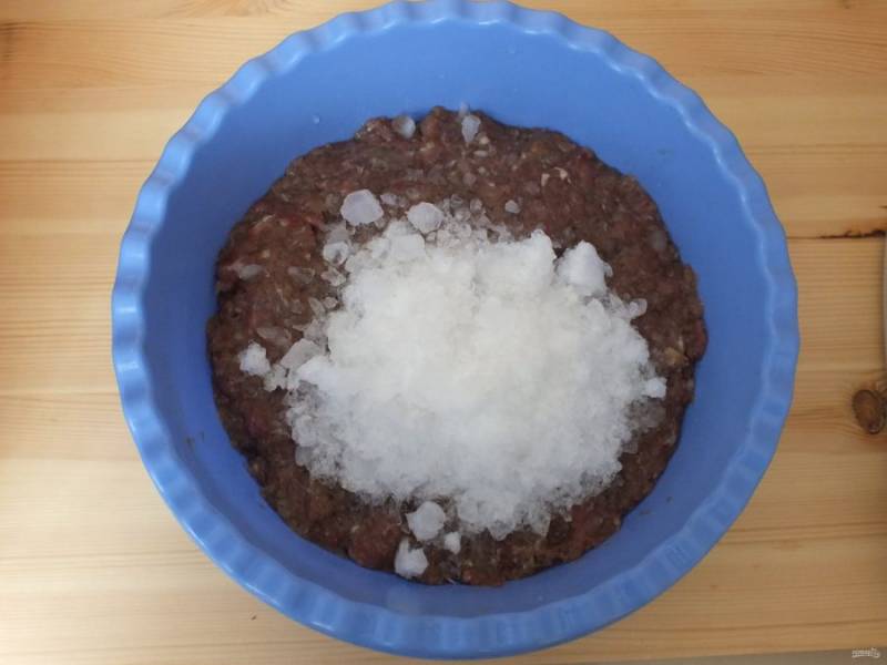 По истечении времени достаньте фарш из холодильника и добавьте измельченный лед. Перемешайте. Уберите в холодильник.